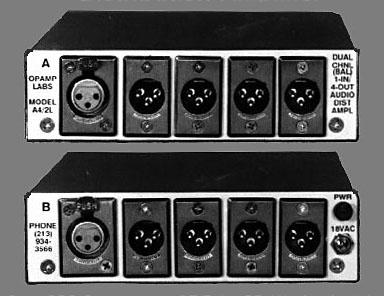 This high quality unit is designed for amplification / distribution of microphone or line signals with Isolation / Distribution for multiple audio signals / locations. The A-4/2L Audio Distribution Amplifier is a device that accepts 2 channels with a single input signal and provides this same signal to up to 4 isolated outputs without ground loops or signal degradation. It can be used for splitting monitor and front of house mixes, and "tapping" a signal prior to sending it through effects units to preserve a "dry" signal for later experimentation.