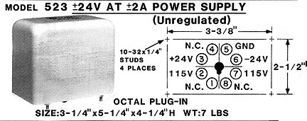 The Model 523 ±24V @ ±2A Bipolar Power Supply is a logic module with Octal Plug-in. This model is Unregulated.